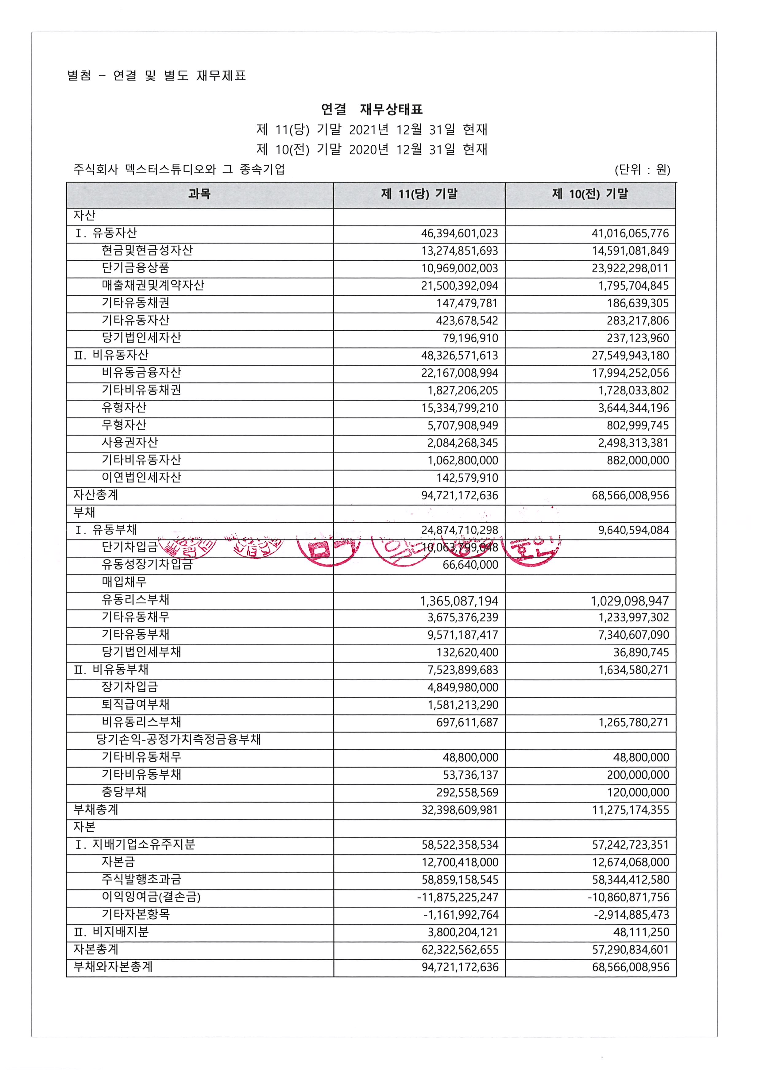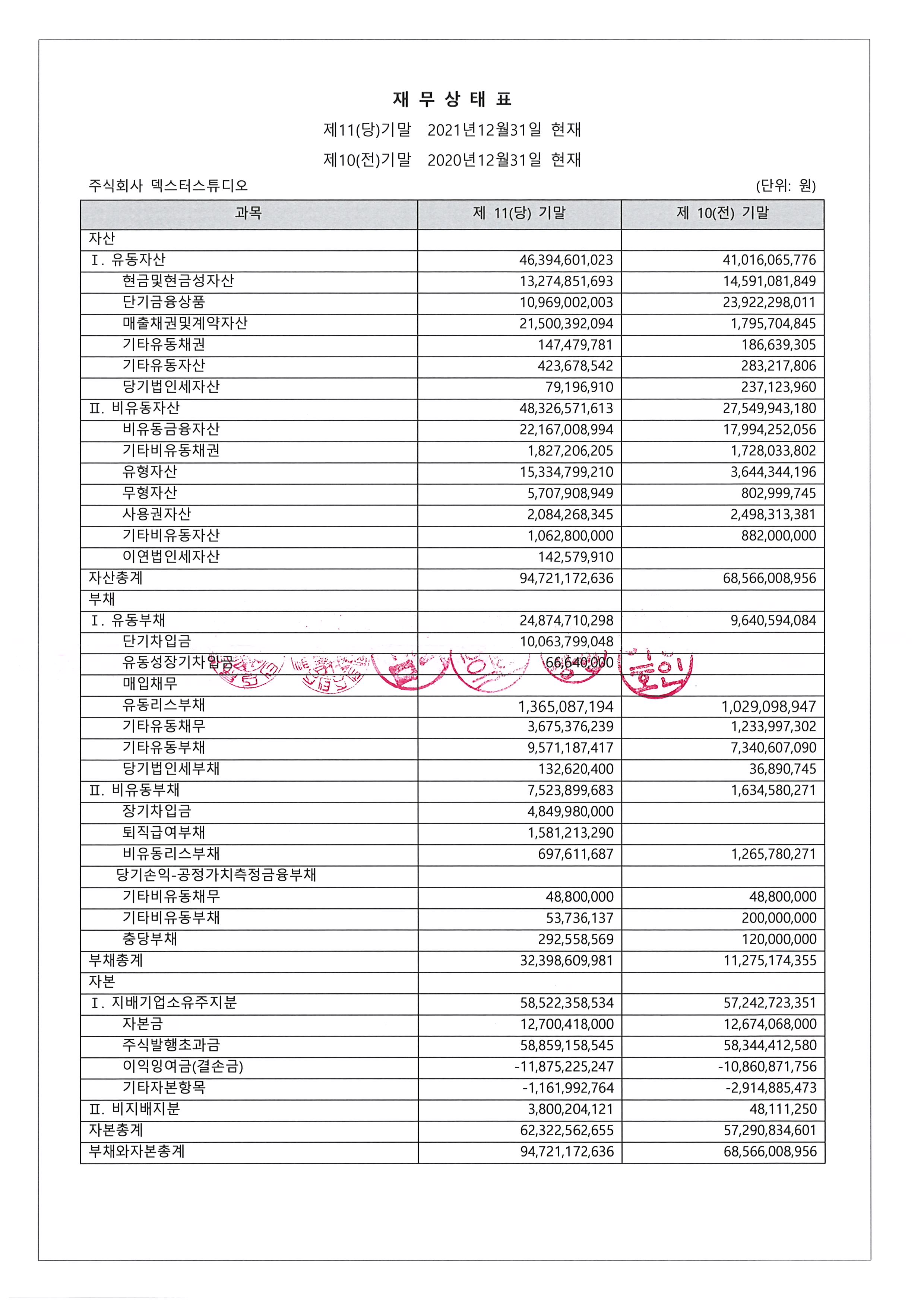 제11기 덱스터스튜디오 재무상태표(대차대조표) 공고